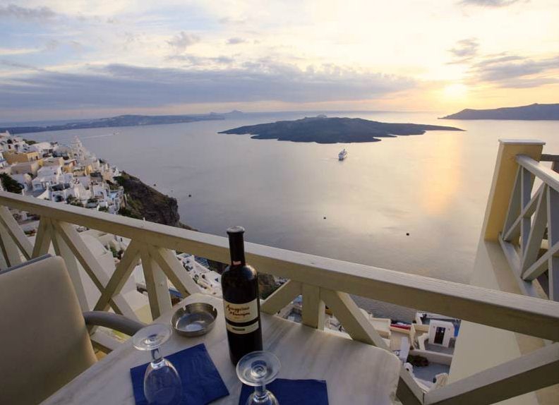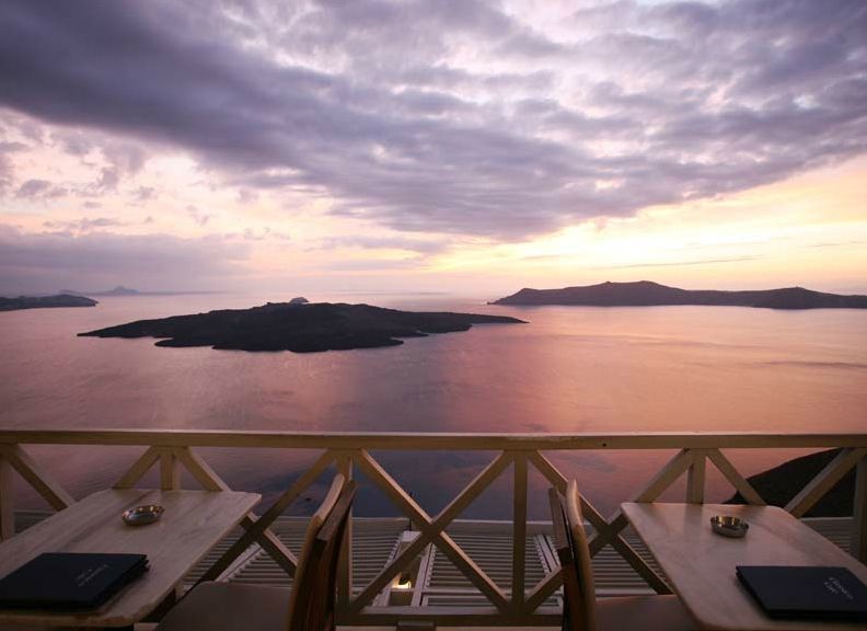 Blandt de flerniveau terrasser vil du finde dit ideelle sted at nyde den betagende udsigt og det grænseløse blå hav. Diskret musik og en af de bedste espresso på øen vil fuldende scenen på det fineste sted i byen at se og fotografere den berømte solnedgang på Santorini.