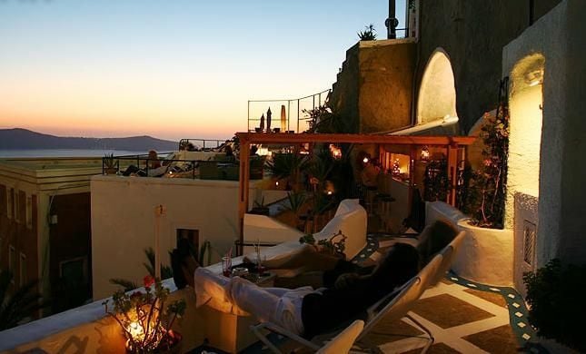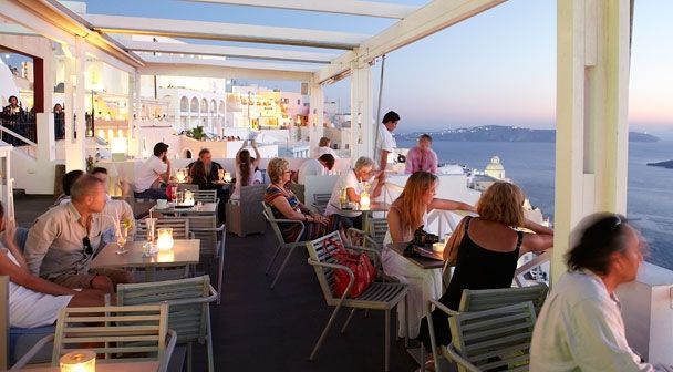 At slappe af på Franco's Bar på klippen i Fira er en magisk oplevelse, som ikke må gå glip af. Nyd dine aftener med at drikke en italiensk 'Fruit - Frullato', en 'Singapore Sling' eller den specielle 'Maria Callas Champagne Cocktail' med dine venner og god musik.