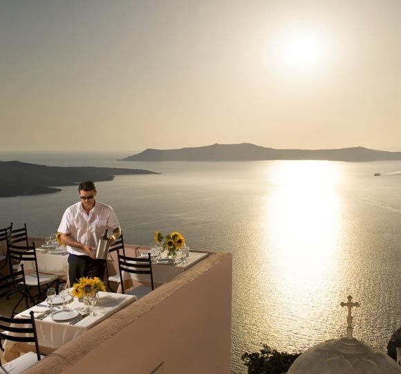 Il Ristorante Sfinge offre cucina mediterranea con prodotti locali e pesce fresco del Mar Egeo. Situato in una residenza restaurata, offre un'atmosfera rilassante per cenare, una selezione di vini eccezionale e una vista unica sulla Caldera di Santorini.